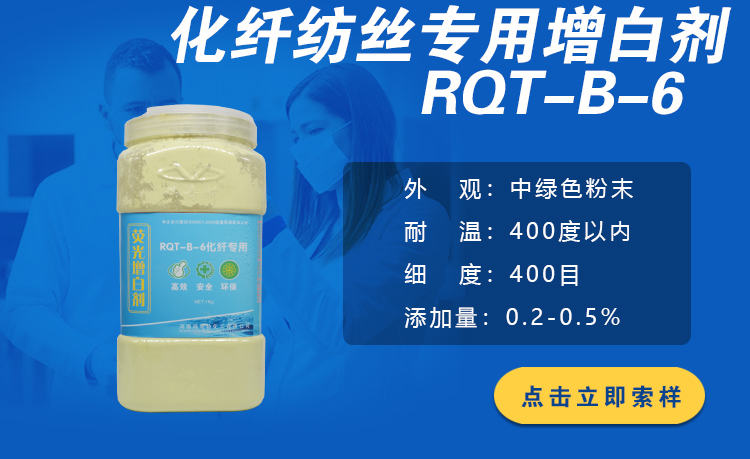 RQT-B-6熒光增白劑是一款我公司研發(fā)的新型專業(yè)型號增白劑,它的外觀為中綠色粉末,具有耐候等級極高,耐熱、耐曬、防褪色,增白、增亮、增艷性能顯著!增白強(qiáng)度高,有強(qiáng)烈熒光,通過化纖拉絲高溫與原料相容性好,并且拉絲順暢,不會(huì)出現(xiàn)斷絲的情況。